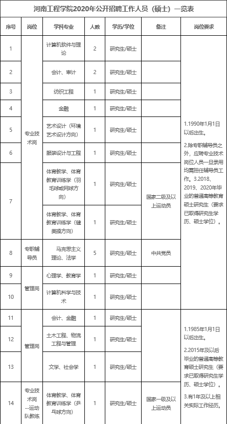 附件:河南工程学院2020年公开招聘工作人员(硕士)一览表