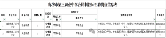 (五)具有岗位要求的相应学历、学位、专业、教师资格证。详见附件《廊坊市第三职业中学合同制教师招聘岗位信息表》。