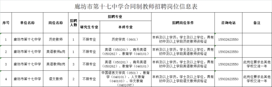 (五)具有岗位要求的相应学历、学位、专业、教师资格证。详见《廊坊市第十七中学2025年合同制教师招聘岗位信息表》。