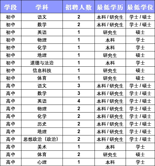 本次招聘涵盖初中、高中两个学段多个学科,各岗位招聘人数、学历学位要求如下:
