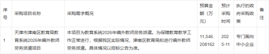 为便于供应商及时了解政府采购信息,根据《天津市政府采购意向公开工作方案》的有关要求,天津市津南区教育局机关2025年10月至2025年12月采购意向详情点击附件查看