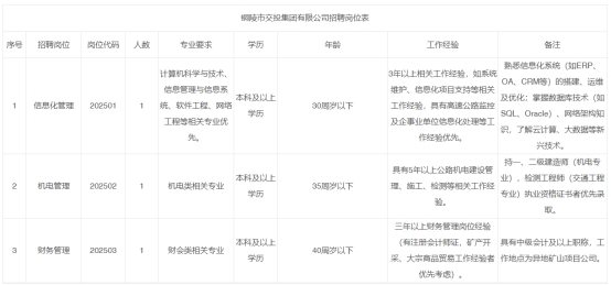 本次招聘为铜陵市交投集团所属两家子公司,其中:信息化管理岗、机电管理岗为同一家子公司,财务管理岗为另一家子公司。具体招聘岗位条件详见附件《铜陵市交投集团招聘工作人员岗位表》。