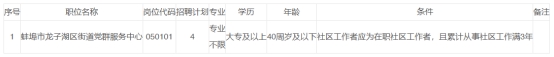 本次计划面向龙子湖区社区工作者招聘事业单位编制内工作人员4名,具体招聘岗位及条件详见附件。