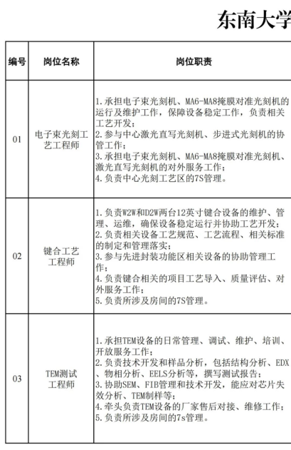 面向社会公开招聘实验技术人员3名。具体岗位职责及招聘要求详见《东南大学微纳系统国际创新中心(无锡)专技岗位招聘说明书》。