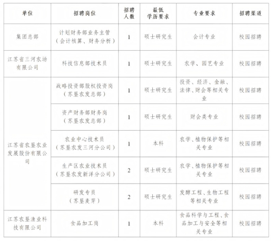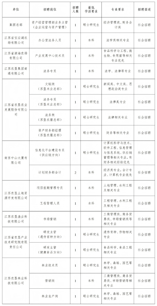 江苏农垦现有农场公司18个、直属全资(控股)企业16个、派出机构6个,土地总面积约180万亩,集团总部及全资(控股)企业在岗职工近万人。经过73年改革发展,江苏农垦建成全省规模最大、现代化水平最高的商品粮生产基地和优质农产品供应基地,形成以现代农业为核心,以医药健康、房地产及相关投资为支撑,一二三产融合发展的省属大型国有企业。现面向应届高校毕业生、社会工作人员公开招聘,具体公告如下。