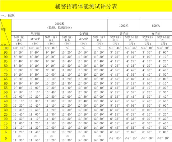 应聘人员通过资格初审后需参加体能测试,项目包括:纵跳摸高和长跑(男1000米、女800米),标准参照《公安机关录用人民警察体能测试项目和标准(试行)》。体能测试任何一项不合格不得进入下一环节,体能测试总分=纵跳摸高成绩50%+长跑成绩50%。测试时间和地点另行通知。