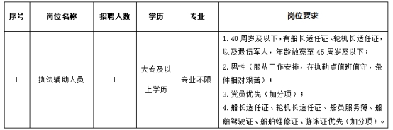 因工作需要,按照“自愿报名、公平竞争、择优录用”的原则,无锡市滨湖区渔政监督大队公开招聘执法辅助人员1名,现将有关招聘事项公告如下: