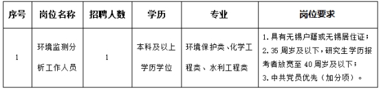 因工作需要,按照“自愿报名、公平竞争、择优录用”的原则,无锡市滨湖生态环境局公开招聘工作人员1名,现将有关招聘事项公告如下: